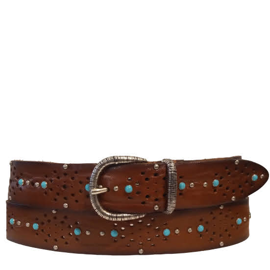 Cintura in vera pelle Made in Italy con borchie smaltate. Variante colore Cuoio.