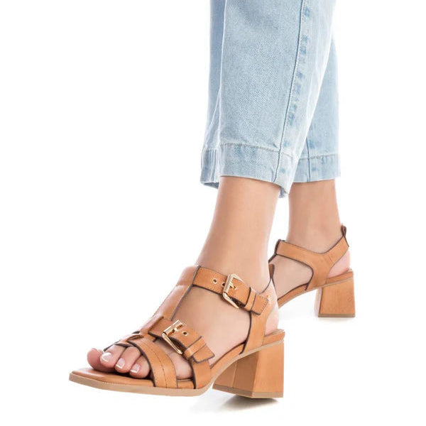Sandalo con tacco in vera pelle. Dettaglio chiusura a cinturino con doppia fibbia. Tacco 7 cm. Variante colore Cuoio.