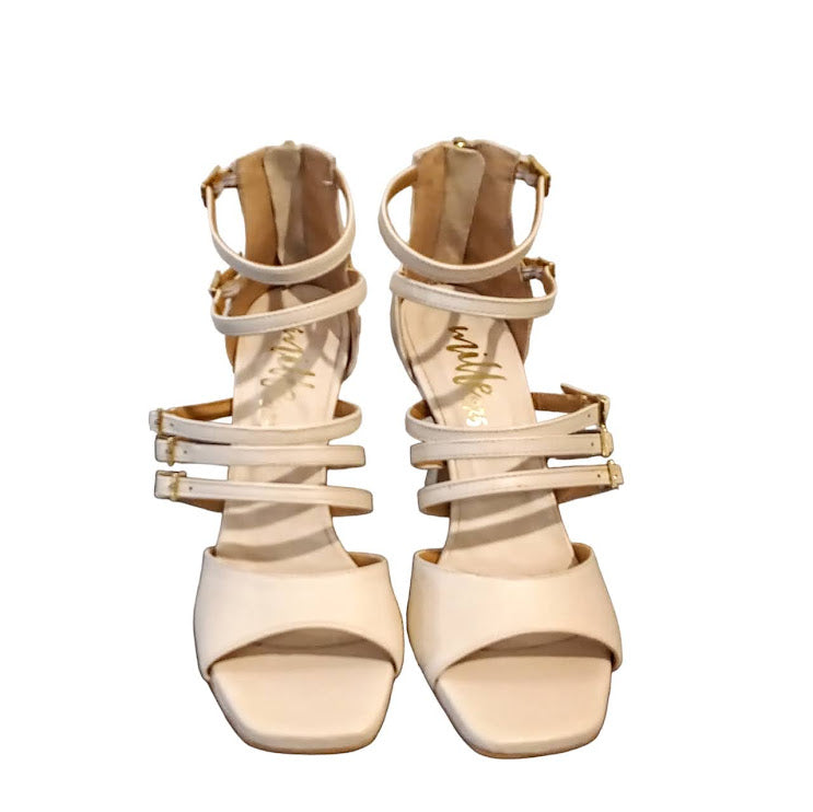 Sandalo in vera pelle Made in Italy. Dettaglio chiusure a cinturino. Tacco 7 cm. Variante colore Burro.