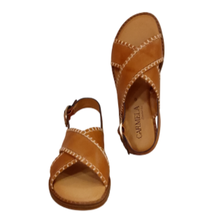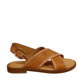 Sandalo in vera pelle con suola soft. Dettaglio chiusura a cinturino. Tacco 1 cm. Variante colore Cuoio.