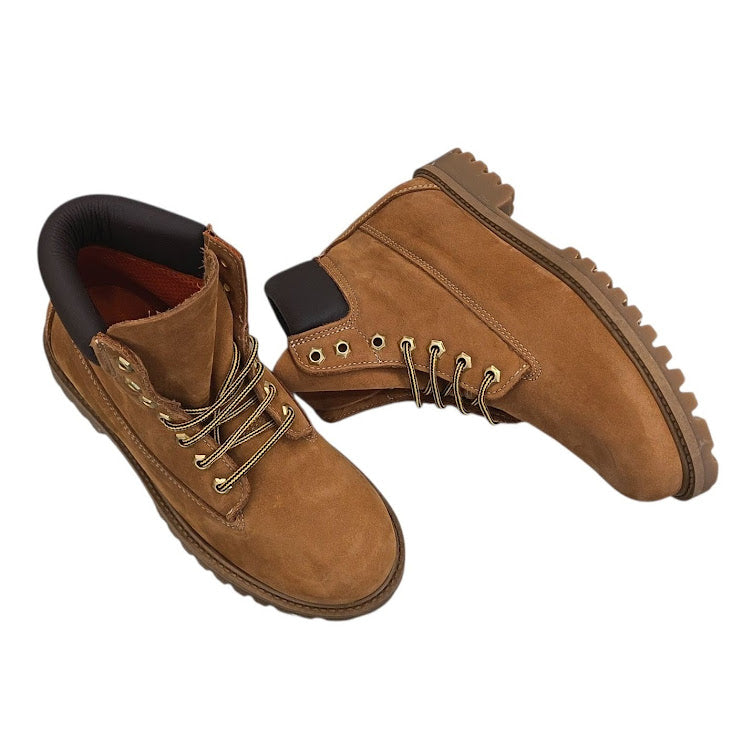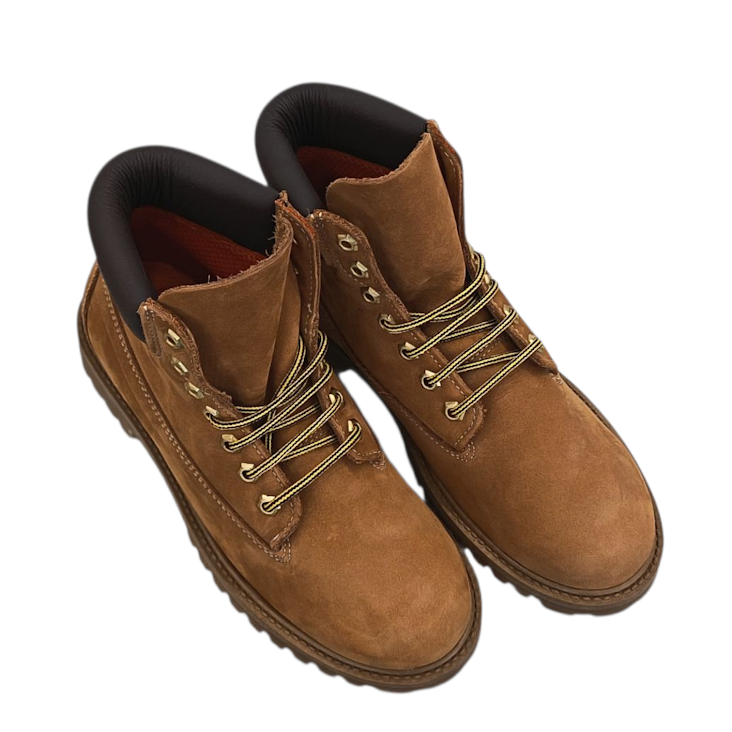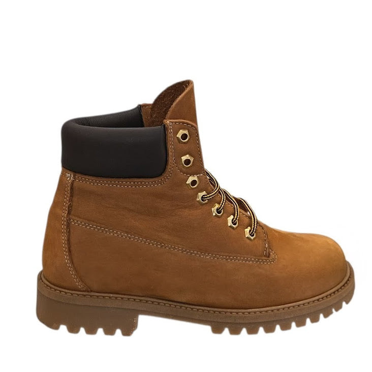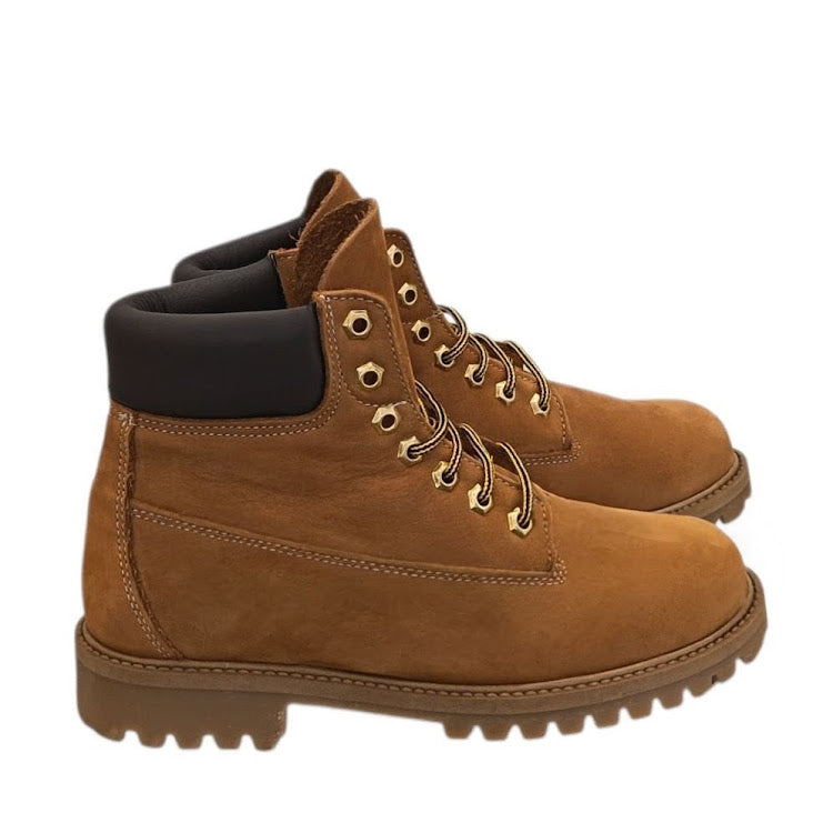 Scarponcino in vera pelle nabuk Made in Italy. Dettaglio interno in tessuto, suola antiscivolo e robusta struttura. Variante colore Giallo Ocra.