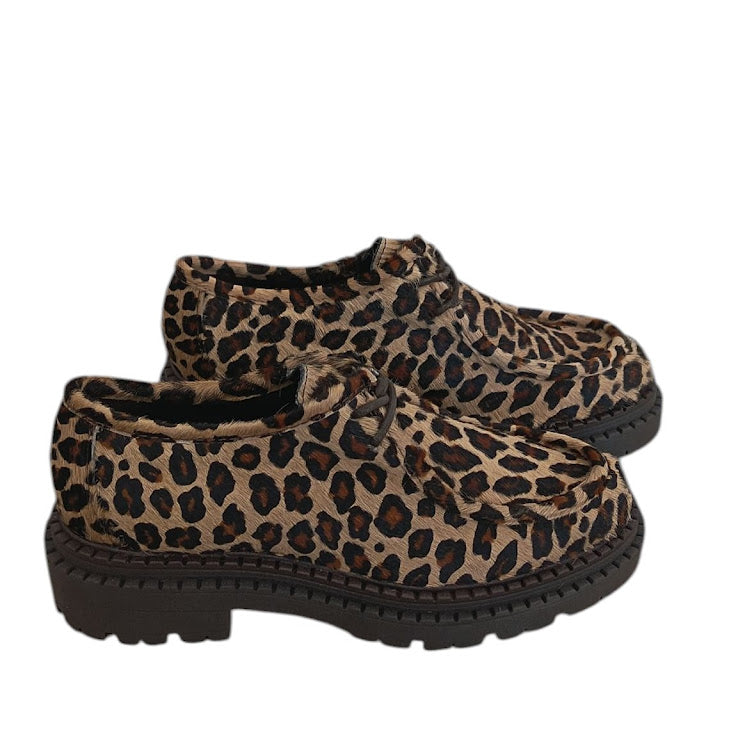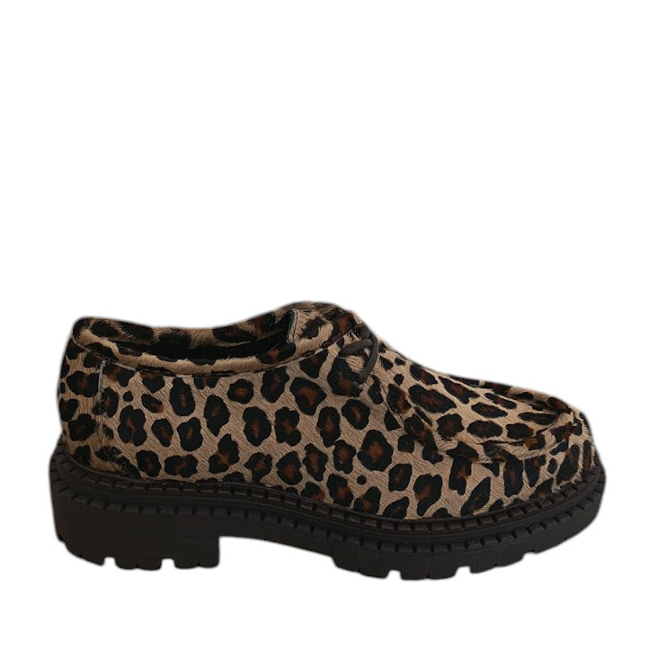 Stringata in vera pelle Made in Italy. Dettaglio tomaia ricoperta in cavallino maculato. Tacco 5 cm. Variante colore stampa animalier Beige/Testa di Moro.