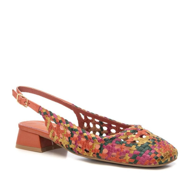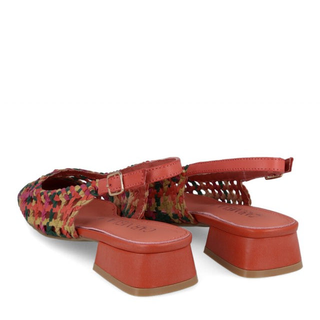 Slingback traforata in vera pelle. Tacco 2 cm. Variante colore Arancio/Multicolore.