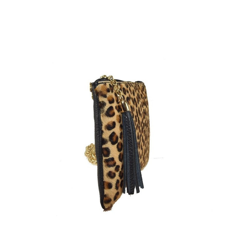 Borsetta a mano in vera pelle cavallino Made in Italy, con tracolla rimovibile e nappina. Variante colore Maculato.