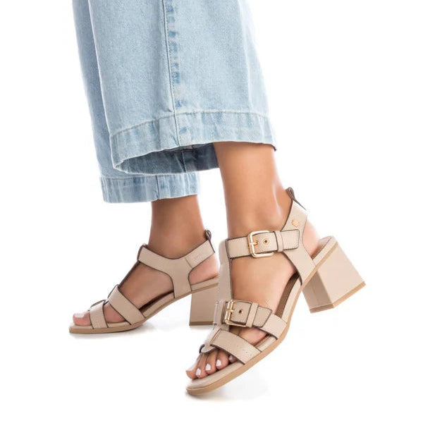 Sandalo con tacco in vera pelle. Dettaglio chiusura a cinturino con doppia fibbia. Tacco 7 cm. Variante colore Burro.