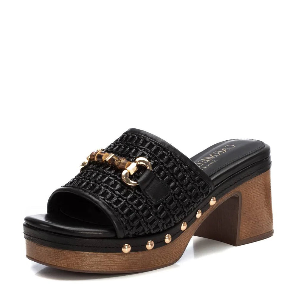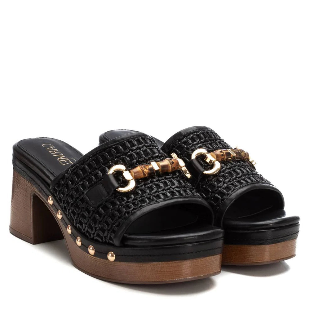 Sabot in vera pelle con suola soft. Dettaglio rafia sulla tomaia e morsetto in simil-bamboo. Tacco 7 cm. Variante colore Nero.