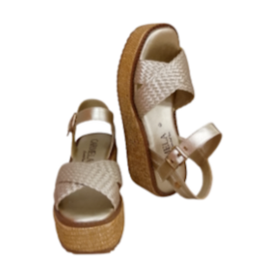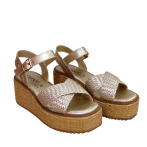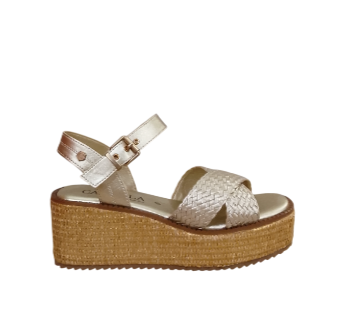 Sandalo in vera pelle laminato con suola soft. Dettaglio chiusura a cinturino. Platform 4 cm. Variante colore Oro.