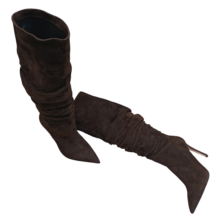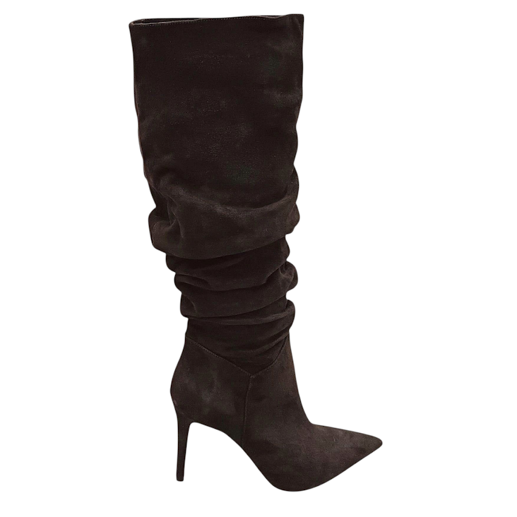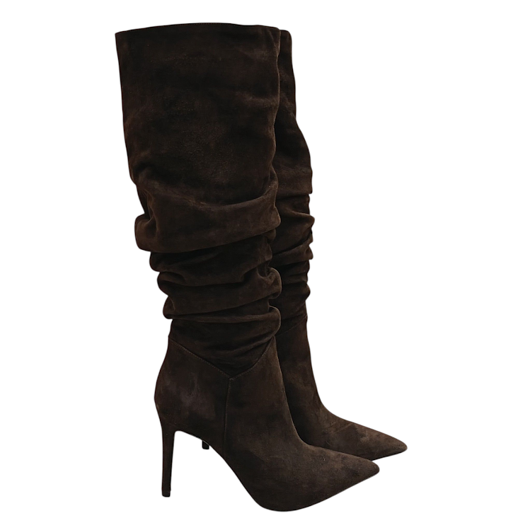 Stivale alto in vera pelle scamosciata Made in Italy. Dettaglio no cerniera. Tacco 10 cm. Variante colore Testa di Moro.