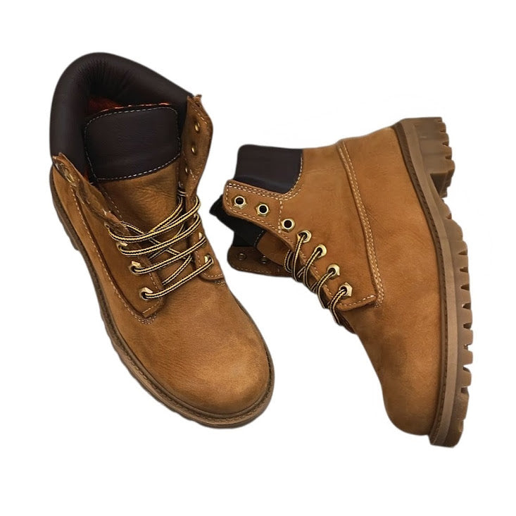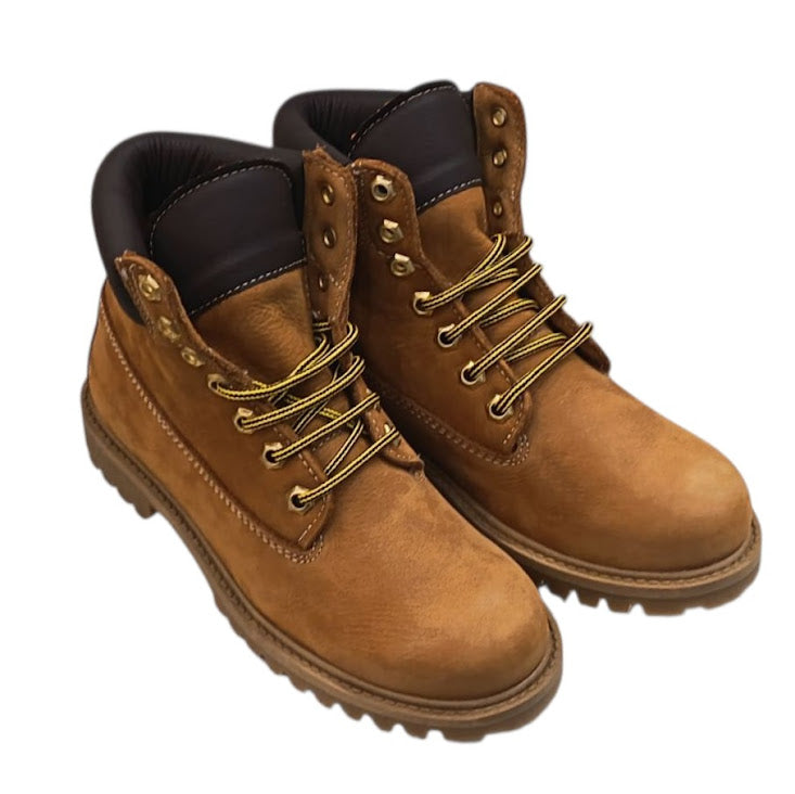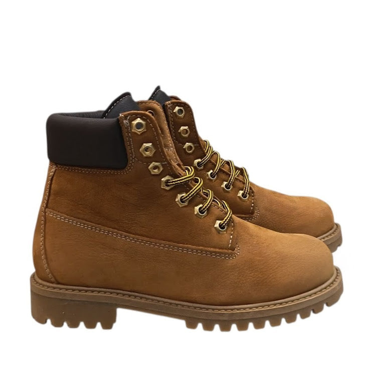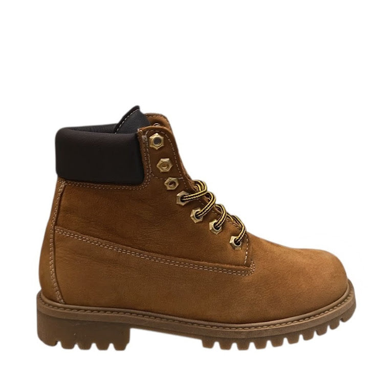 Scarponcino in vera pelle nabuk Made in Italy. Dettaglio interno in tessuto, suola antiscivolo e robusta struttura. Variante colore Giallo Ocra.