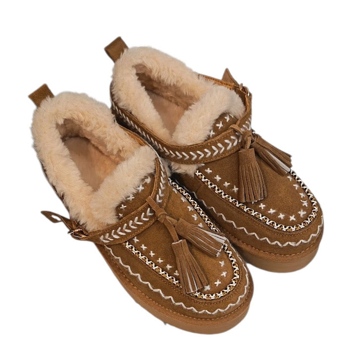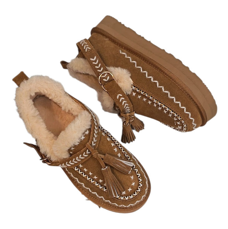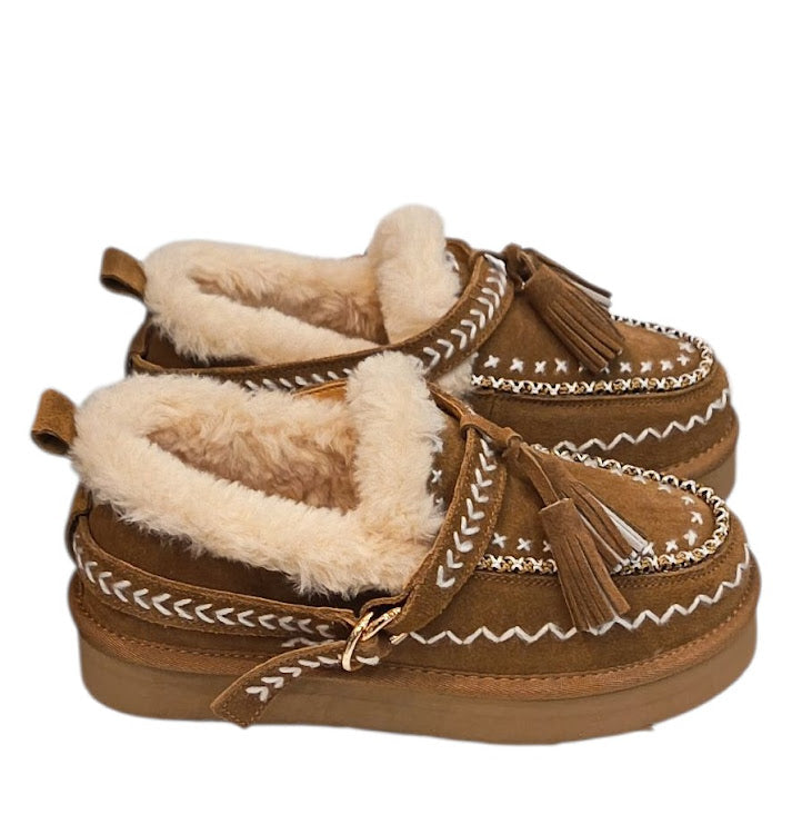 Sabot in vero montone. Dettaglio cuciture sulla tomaia e cinturino con nappine. Platform 4 cm. Variante colore Cuoio.