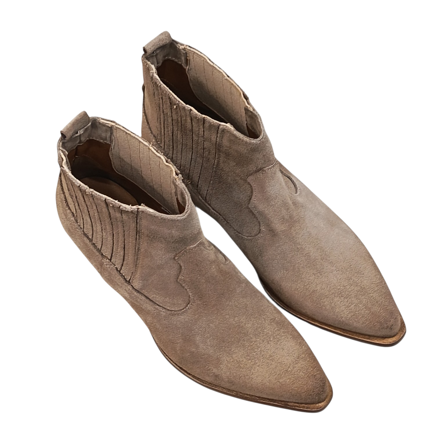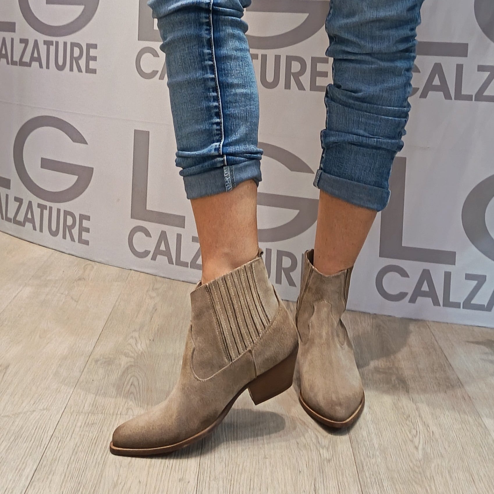 Texano basso scamosciato Made in Italy, no cerniera ma elastici laterali, fodera pelle. Tacco 4 cm. Variante colore Tortora.