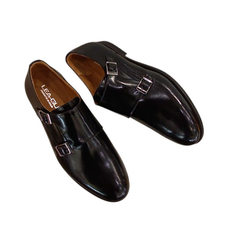 Stringata in vera pelle abrasivata Made in Italy. Dettaglio doppia fibbia, suola in gomma e cuoio. Variante colore Nero.